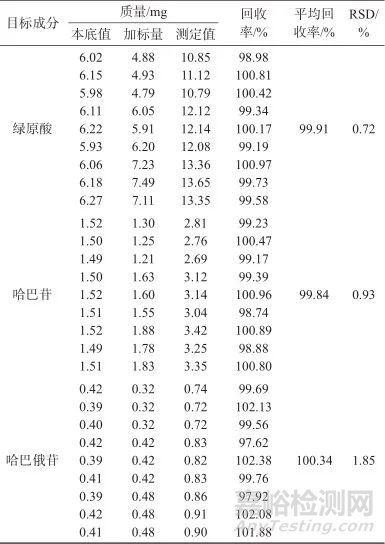 分別精密吸取對(duì)照品貯備溶液適量,置于同一容量瓶中,加入70%乙腈稀釋至標(biāo)線,得不同質(zhì)量濃度的系列對(duì)照品線性混合溶液。取上述溶液按1.2色譜條件進(jìn)樣測(cè)定,以各成分對(duì)照品質(zhì)量濃度為橫坐標(biāo)(x)、峰面積為縱坐標(biāo)(y),繪制標(biāo)準(zhǔn)工作曲線,計(jì)算線性方程,見表7。取混合對(duì)照品溶液逐級(jí)稀釋,當(dāng)信噪比為3時(shí),測(cè)得綠原酸、哈巴苷及哈巴俄苷的檢出限分別為為0.01、0.05、0.02 μg/mL。