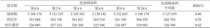 精密稱取S1樣品,按1.3方法制備樣品溶液,按1.2色譜條件,分別在第0、2、4、6、8、24 h進(jìn)樣,記錄色譜圖,數(shù)據(jù)見表9。由表9可見,綠原酸、哈巴苷及哈巴俄苷峰面積測(cè)定結(jié)果的相對(duì)標(biāo)準(zhǔn)偏差分別為0.46%、0.58%、0.62%,表明樣品溶液在24 h內(nèi)穩(wěn)定。