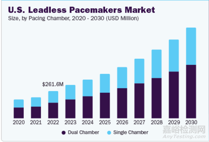 上述情況為無(wú)導(dǎo)線起搏器制造商提供了從傳統(tǒng)起搏器市場(chǎng)獲取份額的機(jī)會(huì)。無(wú)導(dǎo)線起搏器是心臟技術(shù)的一項(xiàng)革命性進(jìn)步,有可能取代傳統(tǒng)起搏器。根據(jù)2022年6月美國(guó)國(guó)家生物技術(shù)信息中心(NCBI)的一篇文章,每年大約記錄有120萬(wàn)臺(tái)起搏器植入手術(shù)。此外,Abbott公司估計(jì),近80%的患者需要對(duì)心臟的上下腔室進(jìn)行起搏。雙腔無(wú)導(dǎo)線起搏系統(tǒng)可以穿透心房和心室,從而減少了與傳統(tǒng)起搏器相關(guān)的并發(fā)癥。