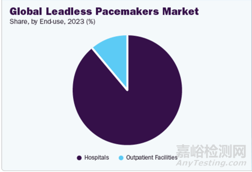 2023年,醫(yī)院部門(mén)以88.86%的收入份額主導(dǎo)了市場(chǎng)。醫(yī)院作為患者招募和參與這些臨床試驗(yàn)的關(guān)鍵中心,在推動(dòng)市場(chǎng)增長(zhǎng)中發(fā)揮著重要作用。例如,2022年3月,克利夫蘭診所成功地在美國(guó)患者身上植入了雙腔室無(wú)導(dǎo)線起搏器系統(tǒng),作為全球臨床試驗(yàn)的一部分。這項(xiàng)研究評(píng)估了Abbott公司的AVEIR無(wú)導(dǎo)線起搏器系統(tǒng)的安全性、功能性和效率。