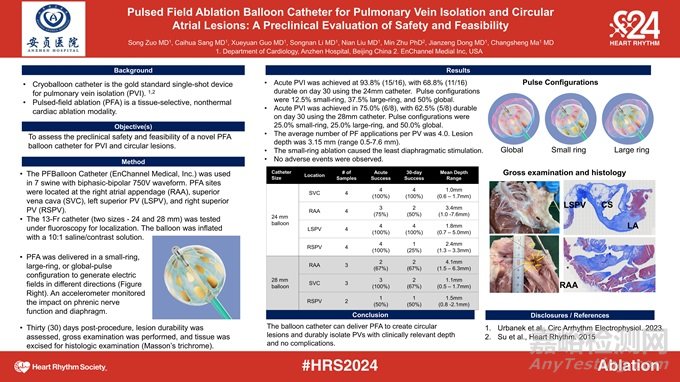 2024年5月,在美國馬薩諸塞州波士頓舉行的 HRS 2024會(huì)議上,心航路醫(yī)學(xué)公司公布了球囊形PFA消融導(dǎo)管用于肺靜脈隔離和環(huán)形損傷病灶的安全性和可行性的臨床前研究結(jié)果: