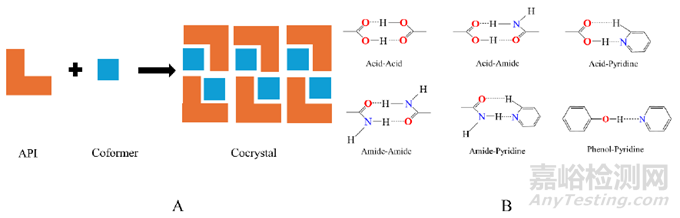 藥物共晶是指在同一晶格中包含兩種或兩種以上不同分子(其中一種是活性藥物成分)以固定的化學計量比通過非離子鍵和非共價鍵結(jié)合形成的晶體, 如圖1A所示, 形成共晶的非共價鍵主要包括氫鍵、π-π堆積作用、范德華力等弱相互作用力, 由于氫鍵本身鍵能較大且具有方向性, 故在共晶形成中占據(jù)主要地位。