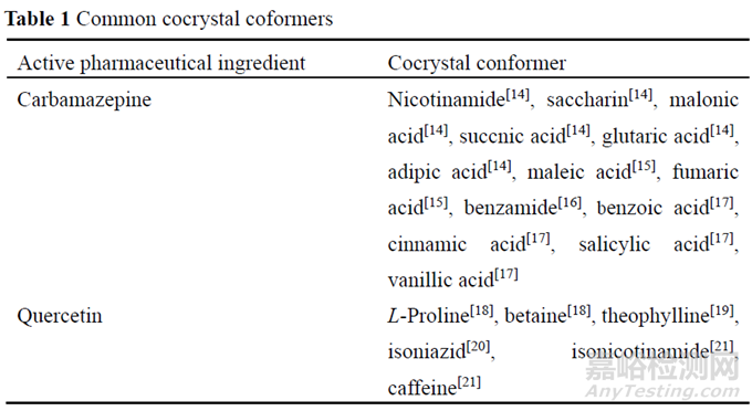 美國食品和藥物管理局(Food and Drug Administration, FDA)與歐洲食品和藥物管理局(European Medicines Agency, EMA)對共晶的定義有所不同, FDA將共晶分類為“溶劑化物的一種特殊情況, 且第二組分(配體)不是溶劑”, 并認為共晶不屬于新的活性物質(zhì); 而EMA指出“共晶與鹽具有許多概念上的相似之處, 溶劑合物應視為共晶的其中一類”, 并且EMA認為如果某種共晶對藥物的療效與安全性有所改善, 應視為新的活性物質(zhì)。共晶配體的選擇通常為安全無毒性物質(zhì), “一般公認安全”(generally recognized assafe, GRAS)清單中的化合物均可作為藥學上可接受的共晶配體, 常用的共晶配體如表1所示(以卡馬西平共晶和槲皮素共晶為例)。
