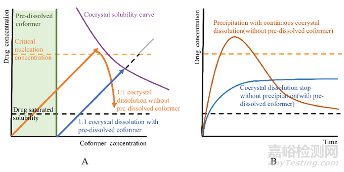 Figure 3 Theoretical cocrystal dissolution mechanisms with /without pre-dissolved conformer. A: Drug concentration-coformer concentration profile; B: Drug concentration-time profile