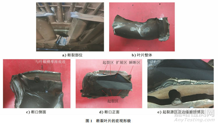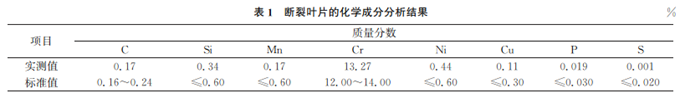 在斷裂葉片上截取試樣,使用直讀光譜儀對(duì)試樣進(jìn)行化學(xué)成分分析,結(jié)果如表1所示。由表1可知:斷裂葉片的化學(xué)成分符合GB/T 8732—2014《汽輪機(jī)葉片用鋼》對(duì)20Cr13鋼的要求。