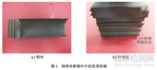 相鄰未斷裂葉片的宏觀形貌如圖2所示。由圖2可知:葉片葉型部位有輕微機(jī)械損傷,葉根的第2,3級(jí)樅樹R角部位存在明顯因葉根與葉根槽沿葉輪切向擺動(dòng)而產(chǎn)生的摩擦痕跡,摩擦區(qū)域表面發(fā)亮。