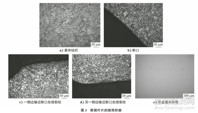 在斷裂葉片斷口處截取金相試樣,對(duì)試樣進(jìn)行金相檢驗(yàn),結(jié)果如圖3所示。由圖3可知:葉片表層及基體的組織均為回火馬氏體;葉片斷口較為平整,裂紋呈穿晶擴(kuò)展形貌,斷口上未見(jiàn)枝杈狀裂紋形貌,斷口附近未見(jiàn)明顯腐蝕坑,在斷口兩側(cè)邊緣起裂區(qū)附近的側(cè)面R角部位可以觀察到多條與斷口互相平行的微裂紋;組織中存在粗系1.5級(jí)的環(huán)狀氧化物類(D類)非金屬夾雜物,符合標(biāo)準(zhǔn)GB/T 8732—2014對(duì)20Cr13鋼的非金屬夾雜物要求。