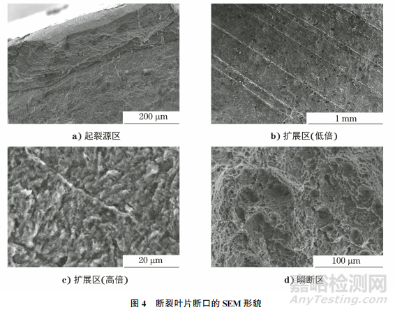 將斷裂葉片的斷口進(jìn)行超聲波清洗后,利用掃描電鏡對(duì)其進(jìn)行觀察,結(jié)果如圖4所示。由圖4可知:斷口的周向兩側(cè)邊緣均存在多處起裂源區(qū),各起裂源區(qū)均位于邊緣摩擦損傷區(qū)域,且起裂源區(qū)內(nèi)存在多條微裂紋;各起裂源區(qū)均未見(jiàn)明顯的腐蝕坑及嚴(yán)重夾雜物等缺陷;擴(kuò)展區(qū)可觀察到明顯互相平行的疲勞條帶,未見(jiàn)解理開裂及沿晶開裂等脆性開裂特征形貌;瞬斷區(qū)可觀察到大量的韌窩,部分韌窩底部有細(xì)小顆粒,呈現(xiàn)典型的韌性斷裂特征。