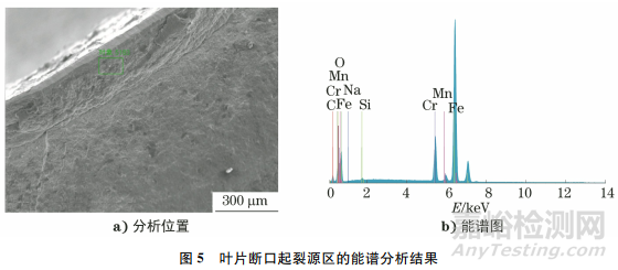 利用能譜分析技術(shù)對(duì)葉片斷口的起裂源區(qū)進(jìn)行分析,結(jié)果如圖5所示。由圖5可知:葉片斷口起裂源區(qū)主要含有Fe、Cr、Mn、C、O和Si等元素,未見(jiàn)腐蝕性元素Cl。
