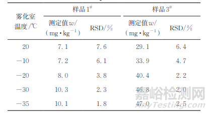 檢測(cè)有機(jī)樣品時(shí),為提高目標(biāo)物檢測(cè)靈敏度,需提高等離子體功率、冷卻氣流量和輔助氣流量,降低霧化氣流量和進(jìn)樣速率。由于樣品中含有易揮發(fā)有機(jī)硅,霧化室溫度對(duì)硅檢測(cè)結(jié)果影響較大。以樣品1#和樣品3#為待測(cè)對(duì)象,試驗(yàn)考察了霧化室溫度對(duì)樣品中總硅測(cè)定值及其相對(duì)標(biāo)準(zhǔn)偏差(RSD)的影響,每個(gè)霧化室溫度下均進(jìn)行5次平行試驗(yàn),所得結(jié)果見表1。