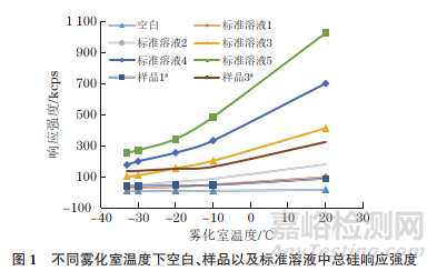 由圖1可知:隨著霧化室溫度的降低,總硅響應(yīng)強(qiáng)度減小并在霧化室溫度不高于-30℃時(shí)趨于穩(wěn)定,且低質(zhì)量分?jǐn)?shù)硅分析物的低溫穩(wěn)定性優(yōu)于高質(zhì)量分?jǐn)?shù)硅的。綜合考慮,試驗(yàn)選擇的霧化室溫度為-30℃。