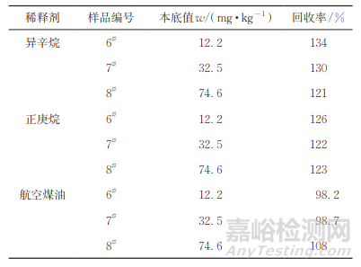 減頂油的溶解試劑有甲苯、二甲苯、異辛烷、正庚烷、航空煤油等,由于苯、二甲苯的毒性大,因此試驗(yàn)重點(diǎn)考察了以異辛烷、正庚烷和航空煤油作稀釋劑時(shí)對(duì)3個(gè)減頂油加標(biāo)樣品(加標(biāo)量5.0mg·kg−1)中總硅回收率的影響,結(jié)果見表2。