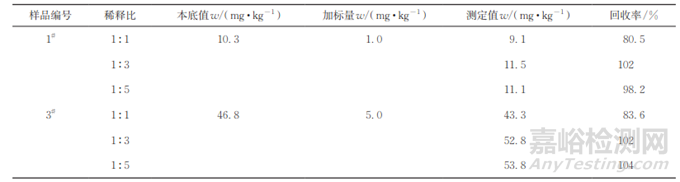由于減頂油樣品為渾濁的輕質(zhì)油,需稀釋劑完全溶解樣品并形成清澈溶液,因此稀釋比的選擇很關(guān)鍵。試驗(yàn)考察了稀釋比分別為1∶1、1∶3和1∶5時(shí)對(duì)加標(biāo)樣品中總硅回收率的影響,結(jié)果見表3。
