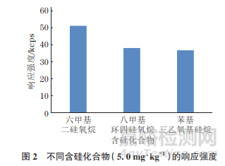由圖2可知,六甲基二硅氧烷的響應(yīng)強(qiáng)度較高,八甲基環(huán)四硅氧烷和苯基三乙氧基硅烷的響應(yīng)強(qiáng)度差別不大。