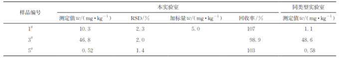 按照試驗(yàn)方法對(duì)3個(gè)減頂油樣品(樣 品1#、樣品3#和樣品5#)進(jìn)行加標(biāo)回收試驗(yàn),每個(gè)樣品平行測(cè)定7次,計(jì)算回收率和測(cè)定值的RSD;同時(shí)將樣品送同類型實(shí)驗(yàn)室按照本方法檢測(cè),結(jié)果見表6。