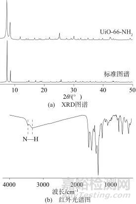 圖1 UiO-66-NH2材料的XRD圖譜和紅外光譜圖