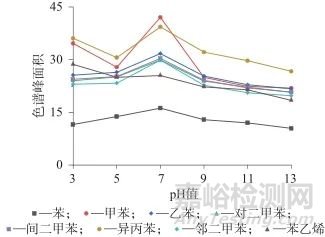 圖2 不同pH值時(shí)水樣的色譜峰面積