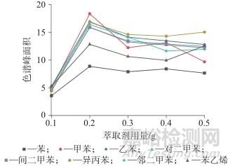 圖3 不同萃取劑用量時(shí)水樣的色譜峰面積