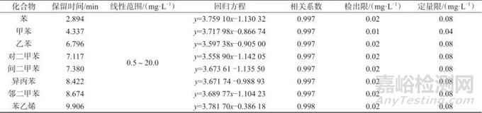 該試驗(yàn)采用外標(biāo)法定量,以目標(biāo)物質(zhì)量濃度為橫坐標(biāo),對(duì)應(yīng)的峰面積為縱坐標(biāo),建立標(biāo)準(zhǔn)曲線。按照HJ 168—2020進(jìn)行試驗(yàn)并計(jì)算方法檢出限,以4倍方法檢出限為定量限。苯系物的保留時(shí)間、線性范圍、線性方程、相關(guān)系數(shù)、檢出限以及定量限見(jiàn)表1。該方法檢出限滿足國(guó)家標(biāo)準(zhǔn)GB/T 11890—1989中二硫化碳萃取法檢出限(0.05 mg/L)及GB 11937—1989中檢出限(0.02 mg/L)的要求。