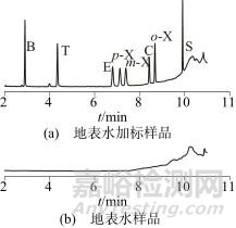 對(duì)地表水水樣進(jìn)行分析,并進(jìn)行2個(gè)質(zhì)量濃度級(jí)別加標(biāo)(1.0、5.0 mg·L-1),按照優(yōu)化的實(shí)驗(yàn)條件進(jìn)行處理,試驗(yàn)結(jié)果見(jiàn)表2,水樣色譜圖見(jiàn)圖6。由表2可知,地表水樣品的加標(biāo)回收率為82.4%~108%,相對(duì)標(biāo)準(zhǔn)偏差為4.7%~8.8%(n=6)。此外,樣品均采用國(guó)家標(biāo)準(zhǔn)GB/T 11890—1989中液液萃取法進(jìn)行測(cè)試,苯系物均未檢出。