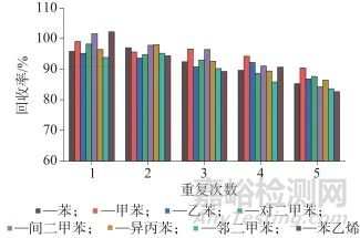 通過(guò)進(jìn)行連續(xù)吸附-解吸實(shí)驗(yàn)研究了UiO-66-NH2材料的可重復(fù)使用性。為了消除上次吸附過(guò)程中的殘留分析物,萃取劑UiO-66-NH2分別用少量二硫化碳、甲醇洗滌2次,然后在65 ℃下干燥后再進(jìn)行下一次使用。多次循環(huán)使用后,萃取劑的萃取效果見(jiàn)圖7。如圖7所示,經(jīng)過(guò)5次循環(huán)使用后,UiO-66-NH2的萃取效率雖然逐漸降低,但苯系物回收率仍在80%以上,因此,UiO-66-NH2作為萃取劑表現(xiàn)出較好的穩(wěn)定性,具有良好的可重復(fù)利用性。