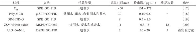 筆者采用配體前修飾法,通過(guò)溶劑熱合成了氨基修飾的UiO-66材料(UiO-66-NH2),并將其作為固相萃取劑吸附水中苯系物,再利用溶劑解析后用GC-FID進(jìn)行分析。同時(shí)研究了pH值、萃取劑投加量、提取時(shí)間等因素對(duì)實(shí)驗(yàn)結(jié)果的影響,確定了最佳實(shí)驗(yàn)條件,并對(duì)其應(yīng)用于水中苯系物的測(cè)定進(jìn)行了方法驗(yàn)證。