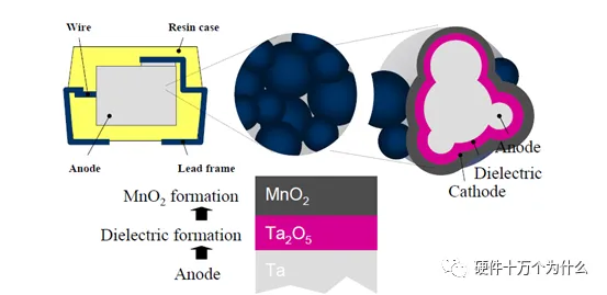 通過上面的描述和動畫,我們可以看到陽極是鉭金屬、介質層是五氧化二鉭、陰極是二氧化錳。因為鉭粉是顆粒狀壓制的,所以表面積足夠大、五氧化二鉭是通過化學反應實現(xiàn)的,所以是包裹在鉭粉表面,同時通過多次處理讓二氧化錳也是包裹在五氧化二鉭的表面。