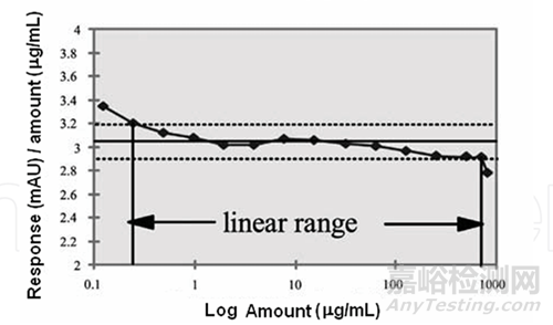我們將上述案例中的主成分進行線性試驗,數(shù)據(jù)覆蓋供試品濃度的0.05%~120%,具體數(shù)據(jù)見表1,以濃度的對數(shù)為橫坐標,以峰面積/濃度為橫坐標,圖譜見圖2,其數(shù)據(jù)如果使用序號1~5數(shù)據(jù)進行線性數(shù)據(jù)統(tǒng)計,范圍為0.5µg/ml~2.4µg/ml(接近選項D),相關(guān)系數(shù)r為0.9999,線性線性方程為y = 0.3929x + 0.0189;如果使用序號1~8數(shù)據(jù)進行線性數(shù)據(jù)統(tǒng)計,范圍為0.5µg/ml~25µg/ml(接近選項C),相關(guān)系數(shù)r為1.0000,線性線性方程為y = 0.3766x + 0.0489,2組數(shù)據(jù)相關(guān)系數(shù)均符合要求,但是線性方程斜率有約4%的偏差;而我們實際使用建立的標準對樣品進行檢測時,使用自身對照法,限度制訂為“不得過對照溶液的**倍”,基準是對照溶液,只進一個自身對照溶液,也就是使用單點法統(tǒng)計數(shù)據(jù)并進行計算,其實質(zhì)是和零點兩點成一直線,也就是只使用序號3數(shù)據(jù),其線性斜率為0.415,所以使用選項C的范圍進行線性與范圍驗證,更僅僅實際應用,也更接近實際結(jié)果。