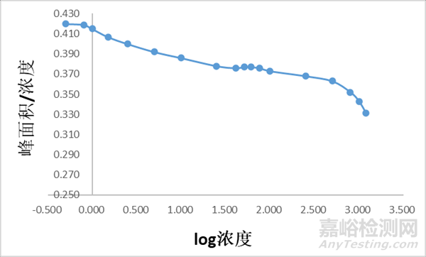 我們知道,液相色譜儀紫外檢測器遵循循朗伯-比爾定律,適用于檢測低濃度物質(zhì),在濃度高時,會發(fā)生偏移。Pedro Lopez Garcia 在Analytical Method Validation一文中指出,以濃度的對數(shù)為橫坐標,以峰面積/濃度為橫坐標,在濃度較高時,數(shù)據(jù)會產(chǎn)生負偏差,典型圖譜見圖1,而這樣的偏差在線性相關(guān)系數(shù)等評價數(shù)據(jù)中難以被發(fā)現(xiàn)。