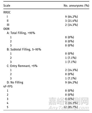 表1:在中位隨訪7.5個(gè)月后,對(duì)14例兔囊狀側(cè)壁動(dòng)脈瘤置入ReSolv支架后的RROC、OKM和4F-FPS動(dòng)脈瘤評(píng)估評(píng)分