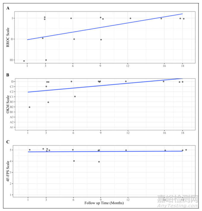 圖1:RROC量表(A)、OKM量表(B)和4F-FPS量表(C)的得分隨隨訪時(shí)間(月)的變化呈最佳擬合(R2分別為0.31、0.28和<0.01)。每個(gè)點(diǎn)表示在指定的時(shí)間點(diǎn)上的一只兔子。為了使單個(gè)分?jǐn)?shù)可視化,數(shù)據(jù)是抖動(dòng)的