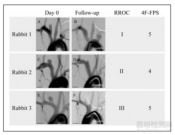 圖2:三位兔側(cè)壁動(dòng)脈瘤在治療(A、C、E)和隨訪(B、D、F)時(shí)的數(shù)字減影血管造影(DSA)圖像,由不知道隨訪時(shí)間點(diǎn)的獨(dú)立觀察者根據(jù)Raymond-Roy和4F-FPS評(píng)分系統(tǒng)進(jìn)行評(píng)估。比例尺的長(zhǎng)度為5毫米。(A)兔1的治療。(B) 兔1的3個(gè)月隨訪。(C)兔2的治療。(D)兔2的6個(gè)月隨訪。(E)兔3的治療。(F) 兔3的3個(gè)月隨訪。