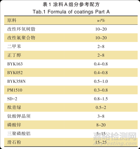 溶劑二甲苯,正丁醇:分析純,國藥集團(tuán);顏填料磷酸鋅、鈦酸鉀晶須、三聚磷酸鋁、酞青綠、滑石粉等:市售;改性環(huán)氧樹脂、改性氟聚合物及胺固化劑:自制 ;分 散 劑 BYK163、消 泡 劑 BYK052、流 平 劑BYK358N:畢克化學(xué);膨潤土SD-2:海明斯公司。