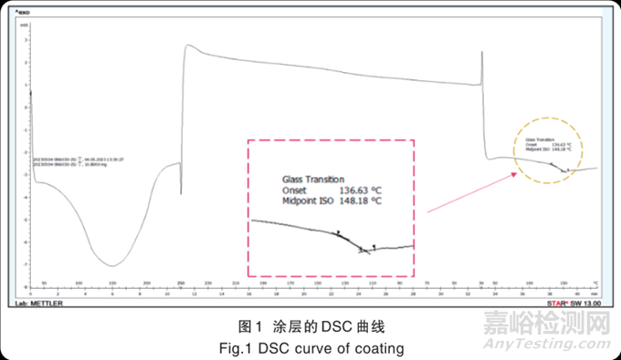 由于涂層中含有 F-C 鍵和苯環(huán)結(jié)構(gòu)、Si-C 鍵等,形成的涂層熱力學(xué)穩(wěn)定性好。通過差示掃描量熱儀DSC 對涂層的熱性能進(jìn)行評價,結(jié)果如圖 1 所示,得到玻璃化轉(zhuǎn)變溫度 T g >130 ℃,證明了該材料具有優(yōu)異的耐溫性,適合應(yīng)用于熱力管道的防腐保護(hù)。