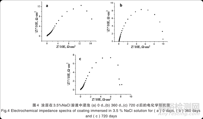 以 A 組分與固化劑配成涂料,制得涂層。將該涂層浸泡入3.5%的NaCl溶液中,分別在未浸泡時、浸泡360 d 以及 720 d 測試其電化學(xué)阻抗。其阻抗譜如圖圖4所示。由圖4可以看出,0~360 d的阻抗譜圖表現(xiàn)為一個高阻抗的單容抗弧,這一階段對應(yīng)的涂層劣化過程為涂層滲水階段。時間增大,抗弧對應(yīng)的圓的半徑減小,涂層電容值增大,說明水不斷地向涂層內(nèi)部滲透。
