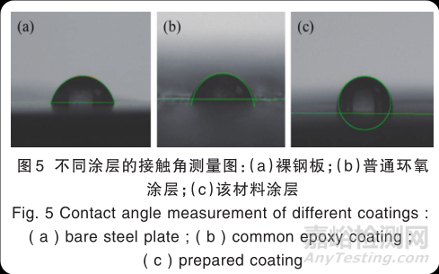 使用接觸角測量儀Kruss DSA100測定涂層與液滴之間的接觸角,計算得出表面能。圖5是裸鋼板、普通環(huán)氧涂層以及該涂層所測得的與水滴之間的接觸角。