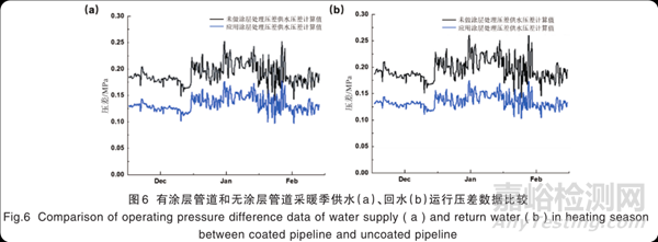 該研究項目已在某熱力工程一次管網(wǎng)項目得到實際應(yīng)用,按照實際工況運行。該項目的管網(wǎng)設(shè)計管徑DN1420,管道里程約10 km(一供一回合計約20 km),焊接方式采用半自動焊接工藝,供水管道設(shè)計溫度130 ℃ ,設(shè) 計 壓 力 2.5 MPa;回 水 管 道 設(shè) 計 溫 度 為70 ℃,設(shè)計壓力2.5 MPa,均采用直埋方式鋪設(shè)。該項目通過高壓無氣噴涂設(shè)備噴涂熱力管道內(nèi)防腐減阻涂料,膜厚為400~500 μm。從圖 6 可以看出,涂覆所制備涂層后,供水和回水運行壓差明顯減小,有涂層管道阻力大小同無涂層管道計算相比明顯減小且變化規(guī)律較為一致,其中實際值相比計算值(未做涂層處理)減小38.7 %,即減阻涂層減阻率為38.7 %。