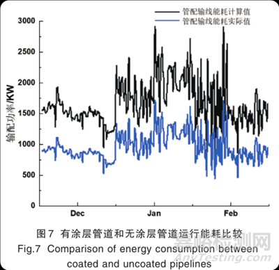 涂層處理后的管線輸配能耗相比未做處理的管線減小約 39 %(見圖 7),折合整個采暖季按照121d節(jié)省能耗約1928.8MW·h。運行能耗的明顯減小對于熱力行業(yè)的低碳發(fā)展具有重要參考意義。