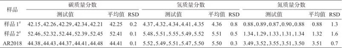 分別對(duì)生物質(zhì)燃料樣品(1#、2#)和生物質(zhì)標(biāo)樣AR2018重復(fù)測(cè)量5次,考察方法精密度與準(zhǔn)確度,結(jié)果見表2。由表2可見,測(cè)量結(jié)果相對(duì)標(biāo)準(zhǔn)偏差(RSD)均小于2.0%,標(biāo)準(zhǔn)樣品測(cè)量值在誤差范圍之內(nèi),精密度和準(zhǔn)確度較好。