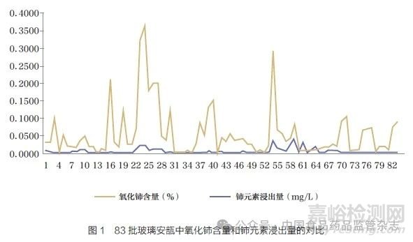由圖1 所示,83 批玻璃安瓿中氧化鈰含量和鈰元素浸出量呈現(xiàn)出一定的正相關(guān)性。