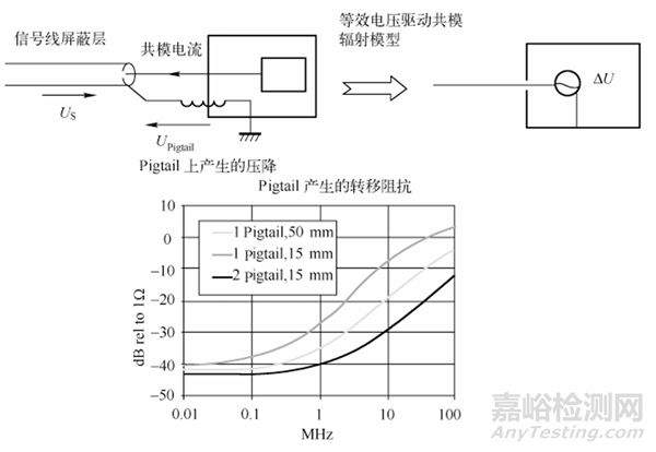 由上圖可得,“Pigtail” 的存在等效成一個(gè)共模電壓ΔU, 并且ΔU驅(qū)動(dòng)著與 “Pigtail” 直接相連的信號(hào)線屏蔽層, 從而形成輻射?