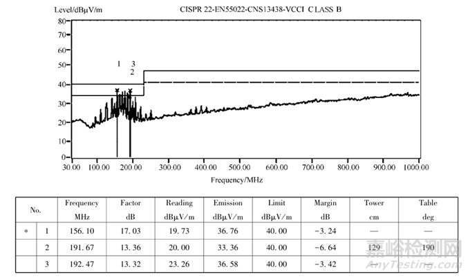 經(jīng)過(guò)初步定位, 去掉信號(hào)輸出電纜后輻射很低, 滿足CLASSB要求, 并有6dB以上的裕量?