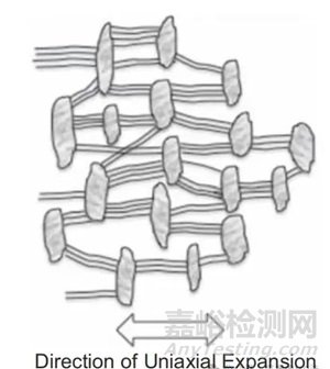 長度的增加必須來自其他來源,而且很可能是由于聚四氟乙烯(PTFE)分子的解旋造成的。觀察圖9,我們可以推測,在層狀晶體相中分子解旋相對于非晶相而言要容易得多。在非晶相中,PTFE分子會發(fā)生纏結,這也正是為什么需要最大化擴張聚四氟乙烯(ePTFE)樹脂的結晶度的原因。