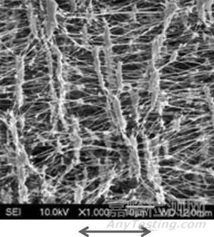 圖2 單向拉伸聚四氟乙烯膜的掃描電鏡(1000x),箭頭表示拉伸方向