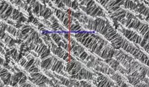 圖4 雙向拉伸聚四氟乙烯膜的掃描電鏡(1000x),垂直交叉的兩條線表示拉伸方向