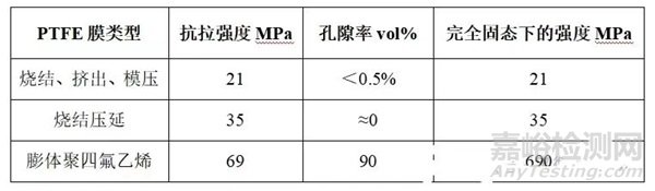纖維在橫截面上目視呈現(xiàn)寬而薄的狀態(tài),最大寬度約為0.1μm(100nm),也就是晶體粒子的直徑。最小寬度可能是一個或兩個分子直徑,或在0.5或1nm范圍內。節(jié)點的大小根據拉伸制程條件的不同,從大約400nm到不到1μm不等。在高溫和高應變速率下拉伸成型的產品擁有更均勻的結構,更小、更密集的節(jié)點,由更多的纖維連接,也更加堅固。表1是包括了ePTFE膜在內各種燒結膜的強度和孔隙率。ePTFE的強度遠遠超過了經過模壓、擠出或壓延處理的PTFE。