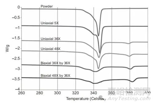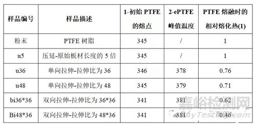 上述得到的PTFE板材在200-300℃下沿MD方向進行拉伸,部分板材只進行單軸拉伸。其他樣品隨后在275-325℃下,在TD方向上進行拉伸后迅速加熱至略低于342℃以進行熱定型,隨后迅速將樣品冷卻至室溫,并在20℃的條件下放置以促進PTFE晶體的第IV相的形成。用加熱/冷卻速率為10℃/min的DSC分析薄膜樣品,樣品重量在4至5mg的范圍內。