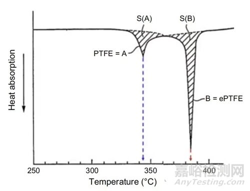 圖6 DSC法熱譜圖顯示ePTFE出現(xiàn)了兩個溫度峰,分別對應聚四氟乙烯(PTFE)(A)和膨體聚四氟乙烯(ePTFE)(B)。S(A)和S(B)代表A和B峰下曲線下的面積。