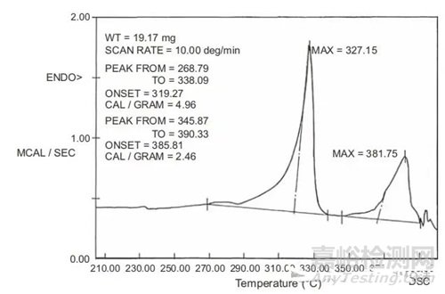 圖8是完全燒結致密化ePTFE薄膜樣品的DSC熱譜圖。致密化過程在拉伸之后,是將拉伸膜加壓壓縮后再進行燒結。在燒結過程中消除了膜樣品的所有孔隙。膜的外觀與標準PTFE膜類似。327.1℃和381.75℃的DSC熱譜圖峰值表明致密化燒結后節(jié)點和纖維的留存。這些峰值有助于驗證膜樣品在致密化前已經膨體化。