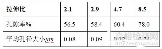 在拉伸過程中,經漿料擠出的膜的長度和寬度會增加許多倍。這種尺寸的擴展在于多孔結構的形成。表4~6概括了兩個方向上拉伸比對效果的影響。